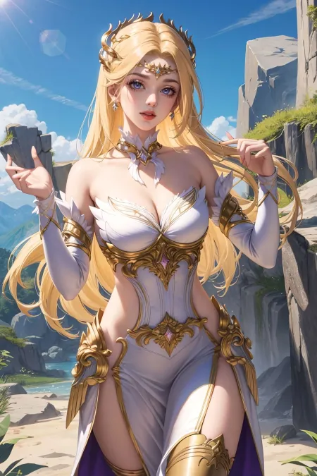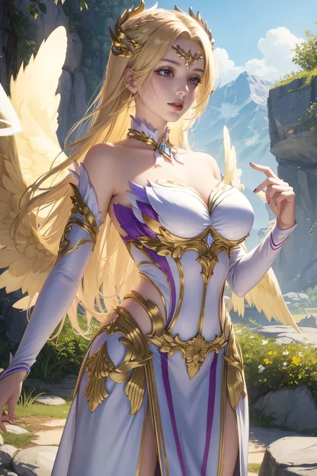 qian_renxue, dress, bare shoulders, white dress, wings, flower
