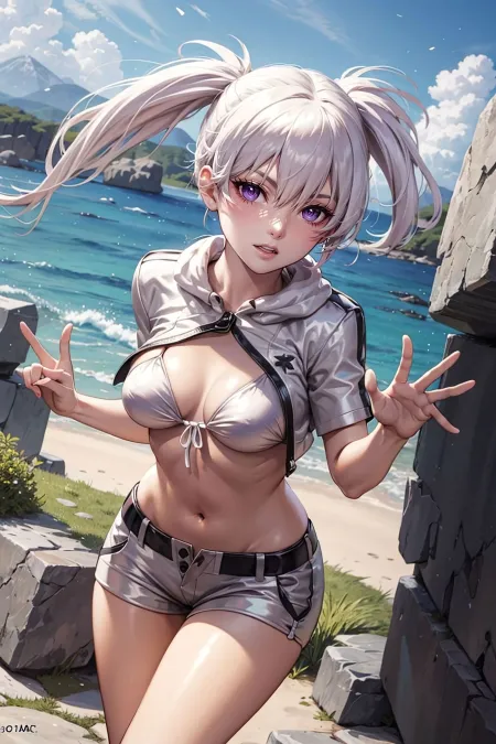 white_rock_shooter, shorts, midriff, swimsuit, bikini, bikini top only, flaming eye, glowing, purple eyes, white shorts, front-tie top, white bikini