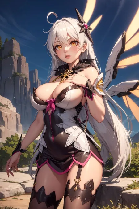kiana_kaslana, hair ornament, very long hair, symbol-shaped pupils, diamond (shape), energy wings, dress