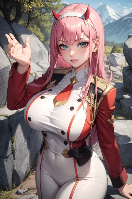 zero_two, long hair, white hairband, straight hair, uniform, necktie, military, military uniform