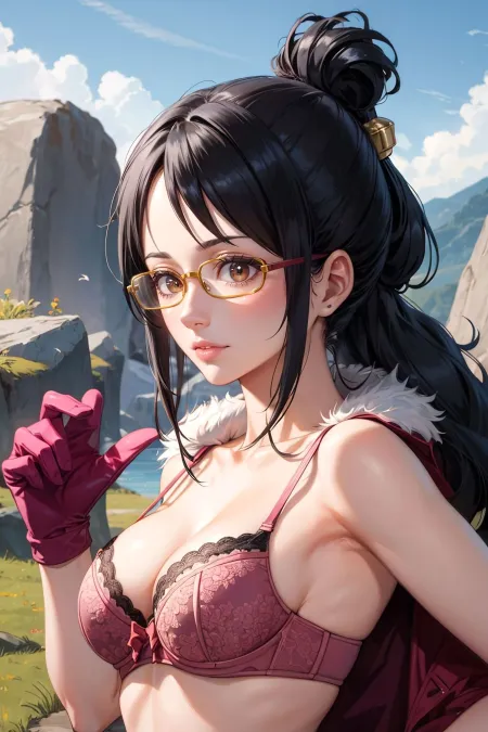 tashigi, black hair, bangs, red-framed eyewear, pink military uniform, fur trim