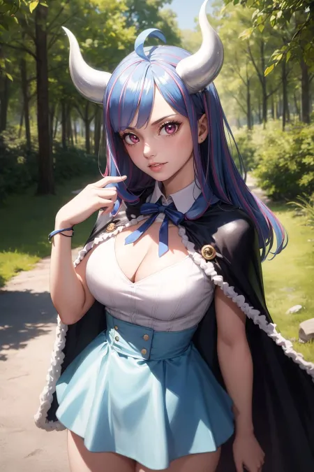 <lora:ulti_one_piece:0.8> ,ulti, long hair, shirt, ahoge, skirt, cape, high-waist skirt, white shirt, curled horns, (covered mouth),