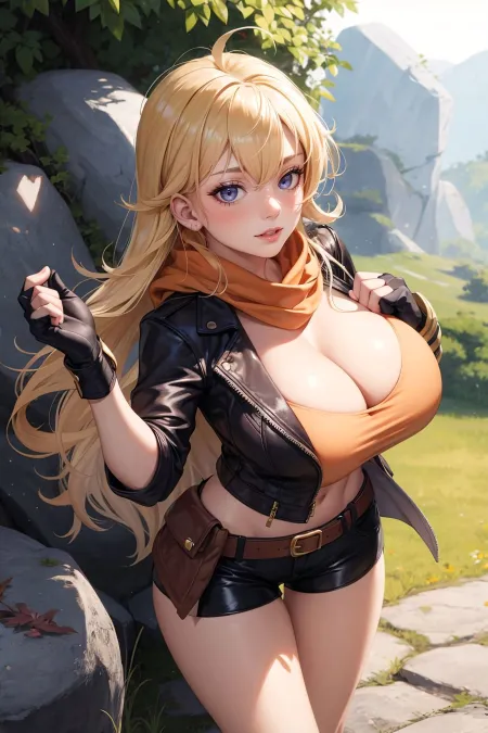 yang_xiao_long, fingerless gloves, midriff, shorts, jacket, scarf, belt